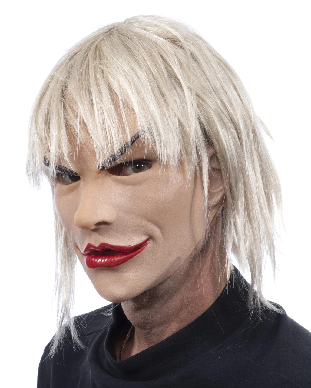 Maskiere dich als Cross Dresser, doch einmal als blonde Tussi, mit dicken roten Schmollmund. Eine richtig schicke Lady ist immer hübsch geschminkt und frisch gestylt um vielelicht schon morgen als Superstar endeckt zu werden. Das etwas zickige Gesicht unserer blonden Diva Frauenmaske, dürfte den Aufstieg in Promi-Kreise kaum schmällern, findest du dich damit doch in bester Gesellschaft.