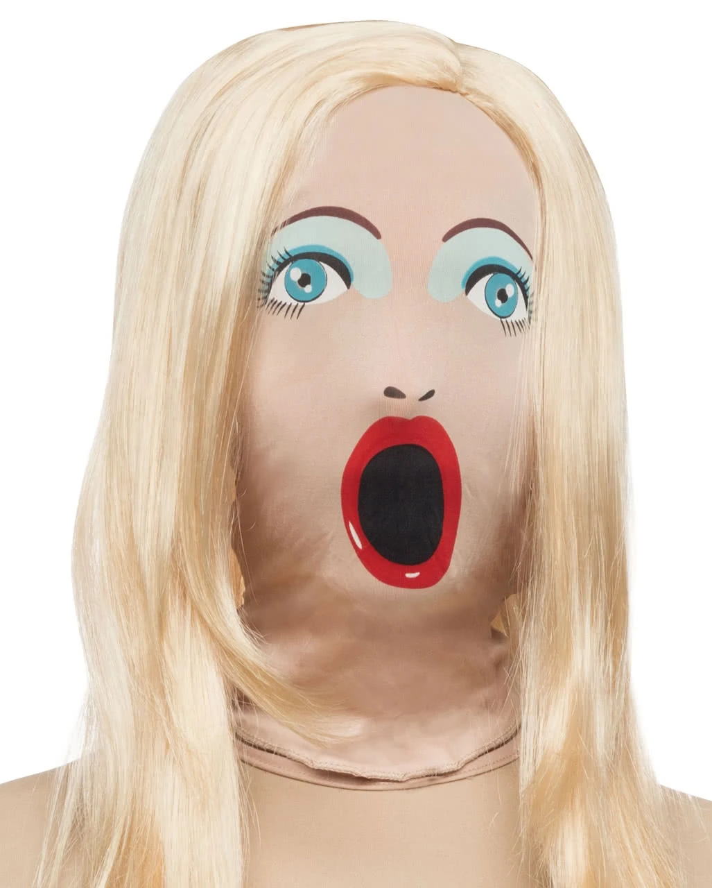 Äüßerst lustige Erotic Doll Maske für den frivolen Fasching, Fetisch Event oder als frecher Scherzartikel für den Junggesellenabschied. Als lüsterne Sex Puppe maskiert bist du bestimmt der absolute Partyhit und Hingucker. Die Stoffmaske mit dem Sex Doll Gesicht und der angenähten blonden Langhaarperücke findet ihren Einsatz auf der Showbühne von Travestie Show, Cabaret und Männerballett ebenso, wie im privaten Bereich von Travestie & Cross Dresser Fans. Extrem witziger Scherzartikel, der garantiert für Aufsehen sorgt.